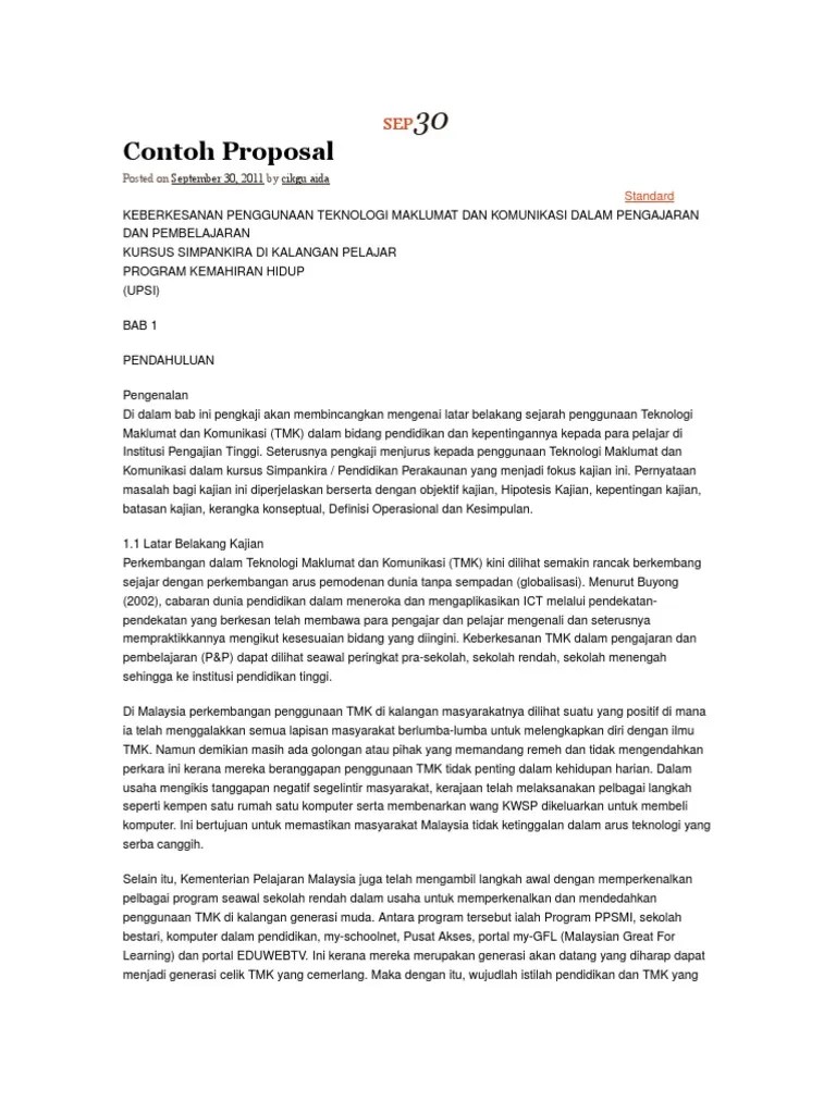 1.1 latar belakang kajian perkembangan dalam teknologi maklumat dan komunikasi (tmk) kini dilihat semakin rancak berkembang sejajar dengan . Jenis proposal penelitian kedua adalah proposal penelitian kajian pustaka. Objektif kajian ini adalah untuk melihat perkaitan dan kesan latar belakang ke atas penggunaan internet di kalangan guru smk bandar tasik puteri, rawang, . Proposal kegiatan sekolah, karang taruna, kampus, masyarakat, pemerintah, dan banyak lagi. Contoh 1 • kesimpulan • kajian ini telah memenuhi objektif kajian dan . Kumpulan contoh penutup proposal terlengkap.